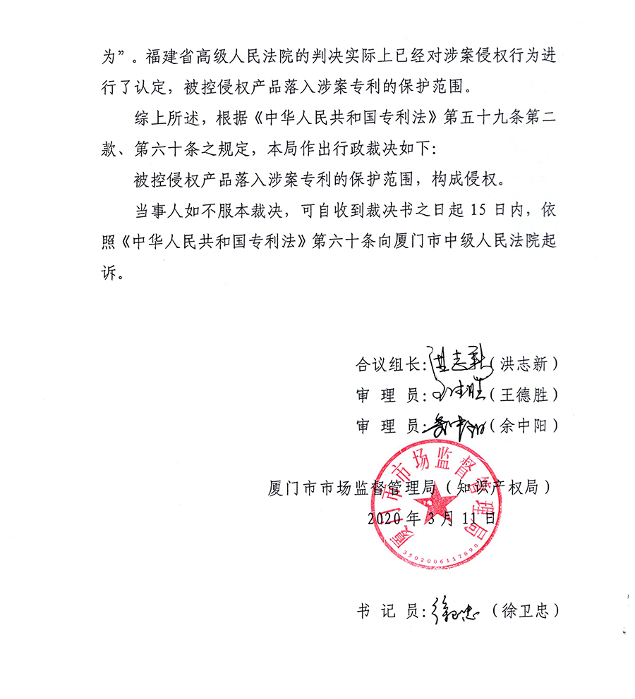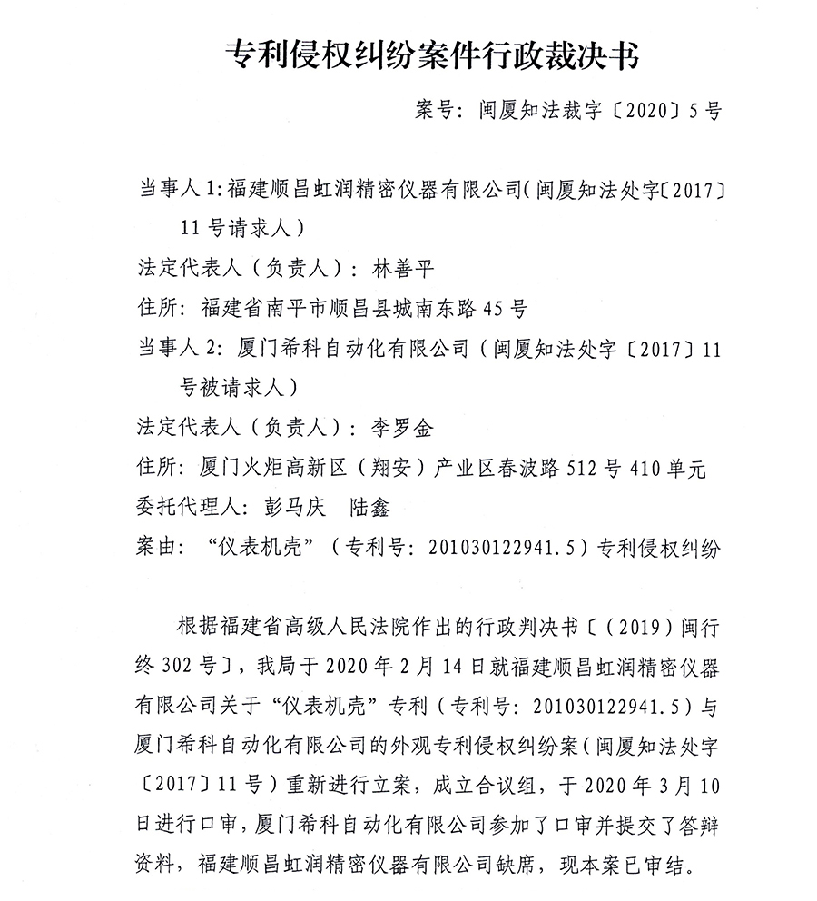根據(jù)福建省高級人民法院作出的行政判決書[(2019)閩行終302號],廈門知識產(chǎn)權(quán)局于2020年2月14日就福建順昌虹潤精密儀器有限公司關(guān)于“儀表機(jī)殼”專利(專利號:201030122941.5)與廈門希科自動(dòng)化有限公司外觀侵權(quán)糾紛案(閩廈知法處字[2017]11號)重新進(jìn)行立案,于2020年3月10日作出審結(jié)裁決,認(rèn)定廈門希科被控的無紙記錄儀侵權(quán)產(chǎn)品落入涉案專利的保護(hù)范圍,構(gòu)成侵權(quán)。