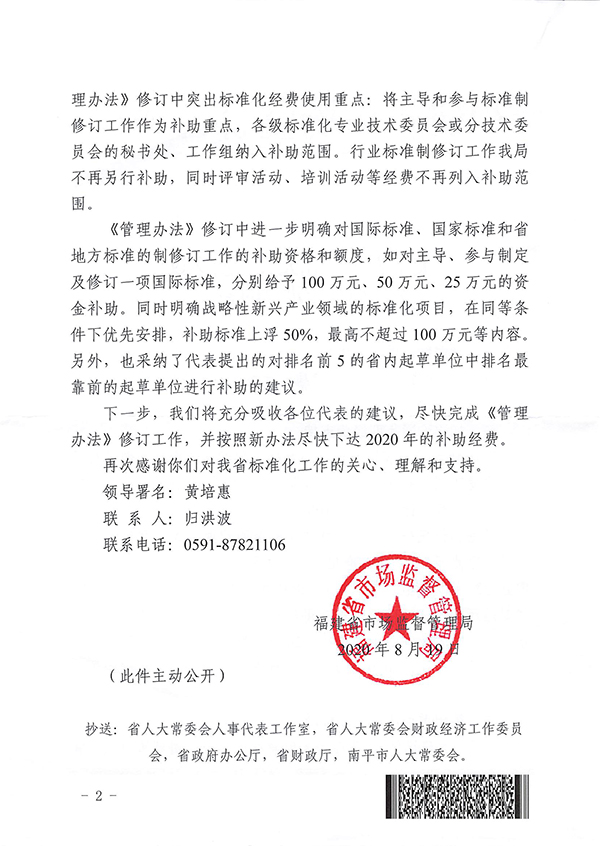 2020年8月19日,福建省市場監(jiān)督局就我的建議作出閩市監(jiān)函[2020]247號答復(fù),答復(fù)中表示,省政府已批準新增加1080萬元資金用于我省標準化專項資金補助。至此標準化專項資金問題得以解決。
