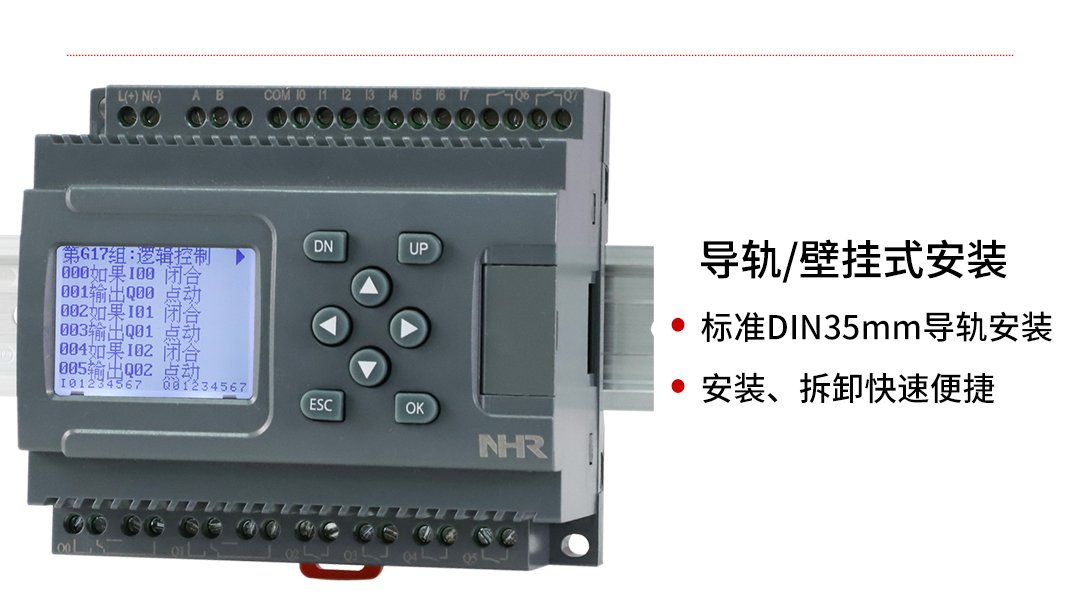 NHR-PR10系列簡易PLC中文一體機是一款中文可編程邏輯控制器,集邏輯判斷、輸出、延時、計時、計 數(shù)、跳轉(zhuǎn)、循環(huán)等功能于一體。適用于公共區(qū)域照明、綠化帶灌溉、養(yǎng)殖投喂控制、設備邏輯控制與時序控制。