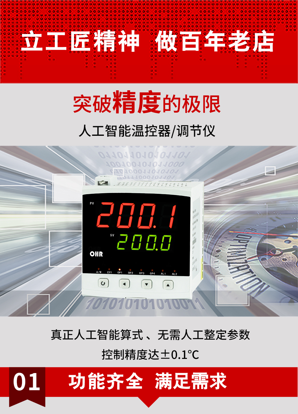 OHR-E300系列人工智能調(diào)節(jié)儀采用真正的人工智能算式,儀表啟動(dòng)自整定功能,可以根據(jù)被控對象的特性,自動(dòng)尋找參數(shù)以達(dá)到很好的控制效果,無需人工整定參數(shù)。控溫精度基本達(dá)±0.1℃,無超調(diào)、欠調(diào),達(dá)國際先進(jìn)水平。