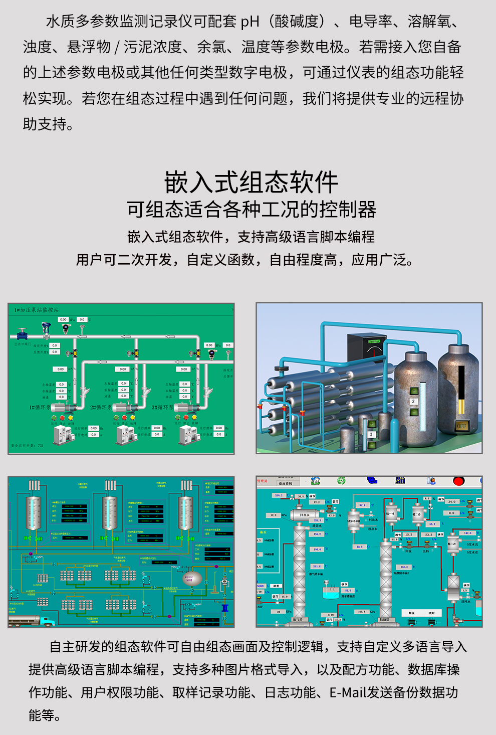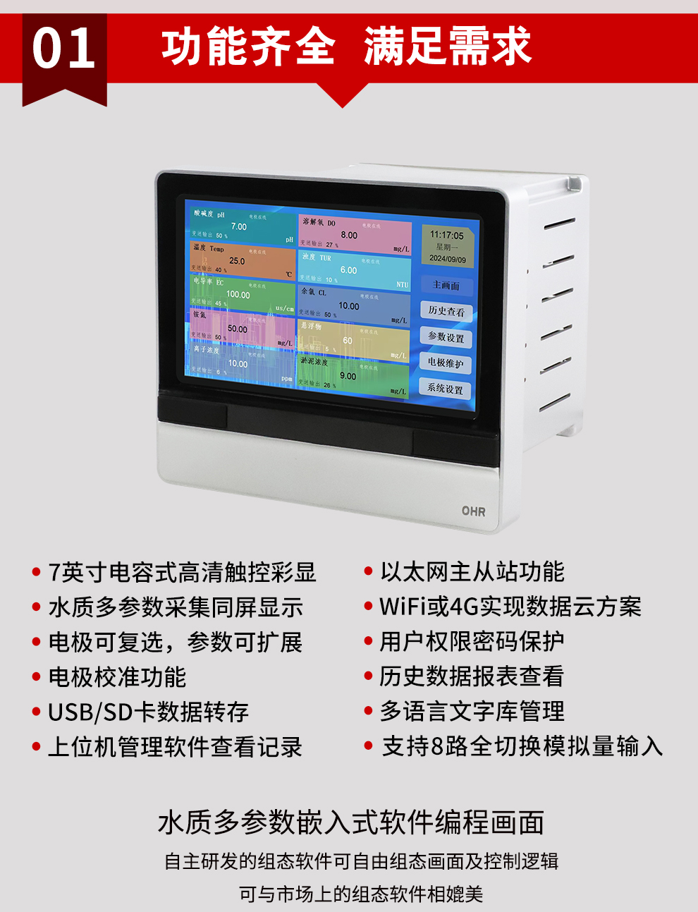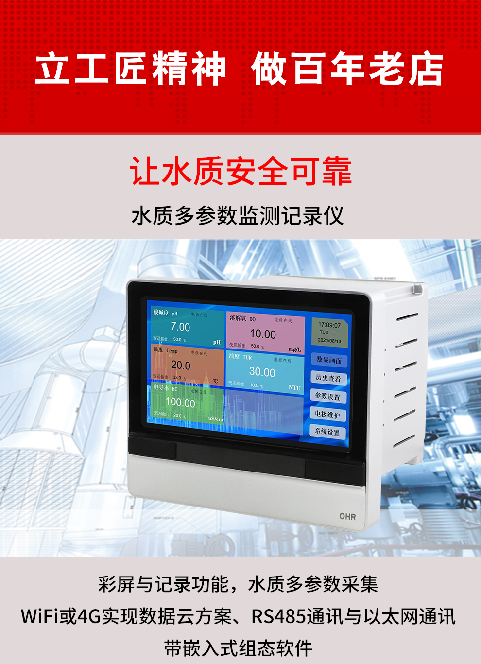 OHR-SZ80系列水質(zhì)多參數(shù)監(jiān)測(cè)記錄儀是一款多參數(shù)可組合的水質(zhì)監(jiān)測(cè)控制器,可通過RS485通訊采集現(xiàn)場(chǎng)pH(酸堿度)、電導(dǎo)率、溶解氧、濁度、污泥、余氯、溫度等水質(zhì)參數(shù),產(chǎn)品可實(shí)現(xiàn)水質(zhì)電極的數(shù)據(jù)采集、記錄分析、變送、報(bào)警控制、以太網(wǎng)通訊、WiFi或4G實(shí)現(xiàn)數(shù)據(jù)云方案。