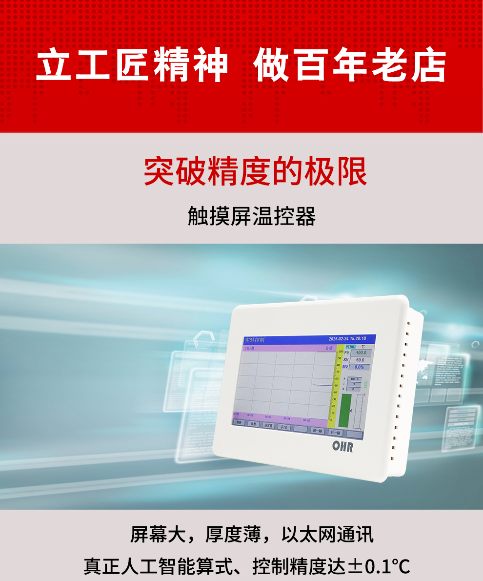 OHR系列觸摸屏溫控器采用真正的人工智能算式,儀表啟動自整定功能,可以根據(jù)被控對象的特性,自動尋找最優(yōu)參數(shù)以達(dá)到很好的控制效果,無需人工整定參數(shù)。控溫精度基本達(dá)±0.1℃,無超調(diào)、欠調(diào),達(dá)國際先進(jìn)水平。4路萬能信號輸入,可帶2路PID 控制,RS485通訊接口,以太網(wǎng)接口。