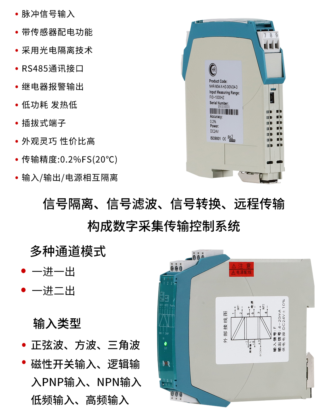 NHR-M34系列智能頻率轉(zhuǎn)換器將頻率信號經(jīng)隔離整形放大后,變送隔離輸出所需的信號,也可向現(xiàn)場的一次儀表提供電源回路。