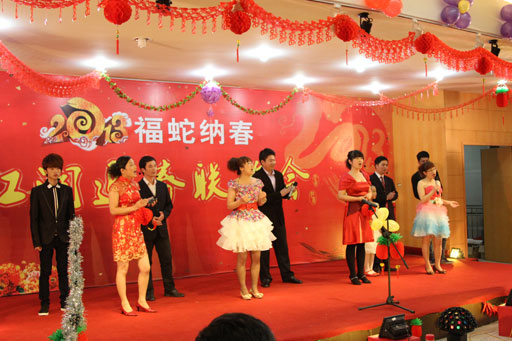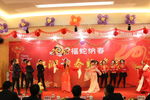 聯(lián)歡會(huì)的現(xiàn)場(chǎng)張燈結(jié)彩,燈火輝煌。紅色舞臺(tái)的背景正中,祥云和鮮花襯托著“2013—福蛇納春”八個(gè)鮮活靈動(dòng)的文字,象征著2013年虹潤(rùn)公司美好的未來(lái)。舞臺(tái)上方,大紅燈籠高高掛起,在燈光的映襯下分外璀璨,舞臺(tái)兩側(cè),霓虹彩燈交相輝映,讓盛裝待發(fā)的演員們個(gè)個(gè)分外精神。五彩繽紛的彩帶和氣球環(huán)繞著現(xiàn)場(chǎng),美麗的中國(guó)結(jié)點(diǎn)綴其中。