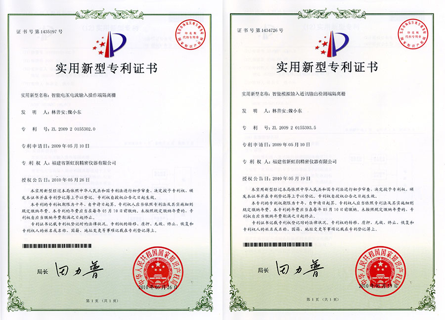 虹潤智能安全柵是虹潤公司全新一代本安系統(tǒng)防爆儀表。產(chǎn)品榮獲智能模擬輸入通訊輸出檢測端隔離柵(專利號 2009201553035)、智能電壓電流輸入操作端隔離柵(專利號2009201553020)2項實用新型專利,智能隔離式安全柵軟件(版權(quán)登記號2008SR21216)1項軟件著作權(quán),獲得國際SIL2功能安全認證證書和國家防爆電氣產(chǎn)品質(zhì)量監(jiān)督檢驗中心頒發(fā)的防爆電氣設(shè)備防爆合格證。
