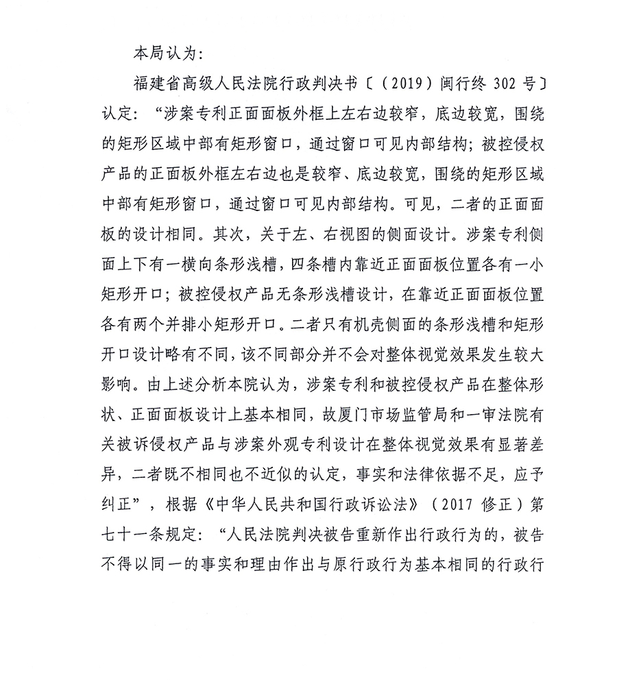 根據(jù)福建省高級人民法院作出的行政判決書[(2019)閩行終302號],廈門知識產(chǎn)權(quán)局于2020年2月14日就福建順昌虹潤精密儀器有限公司關(guān)于“儀表機(jī)殼”專利(專利號:201030122941.5)與廈門希科自動(dòng)化有限公司外觀侵權(quán)糾紛案(閩廈知法處字[2017]11號)重新進(jìn)行立案,于2020年3月10日作出審結(jié)裁決,認(rèn)定廈門希科被控的無紙記錄儀侵權(quán)產(chǎn)品落入涉案專利的保護(hù)范圍,構(gòu)成侵權(quán)。