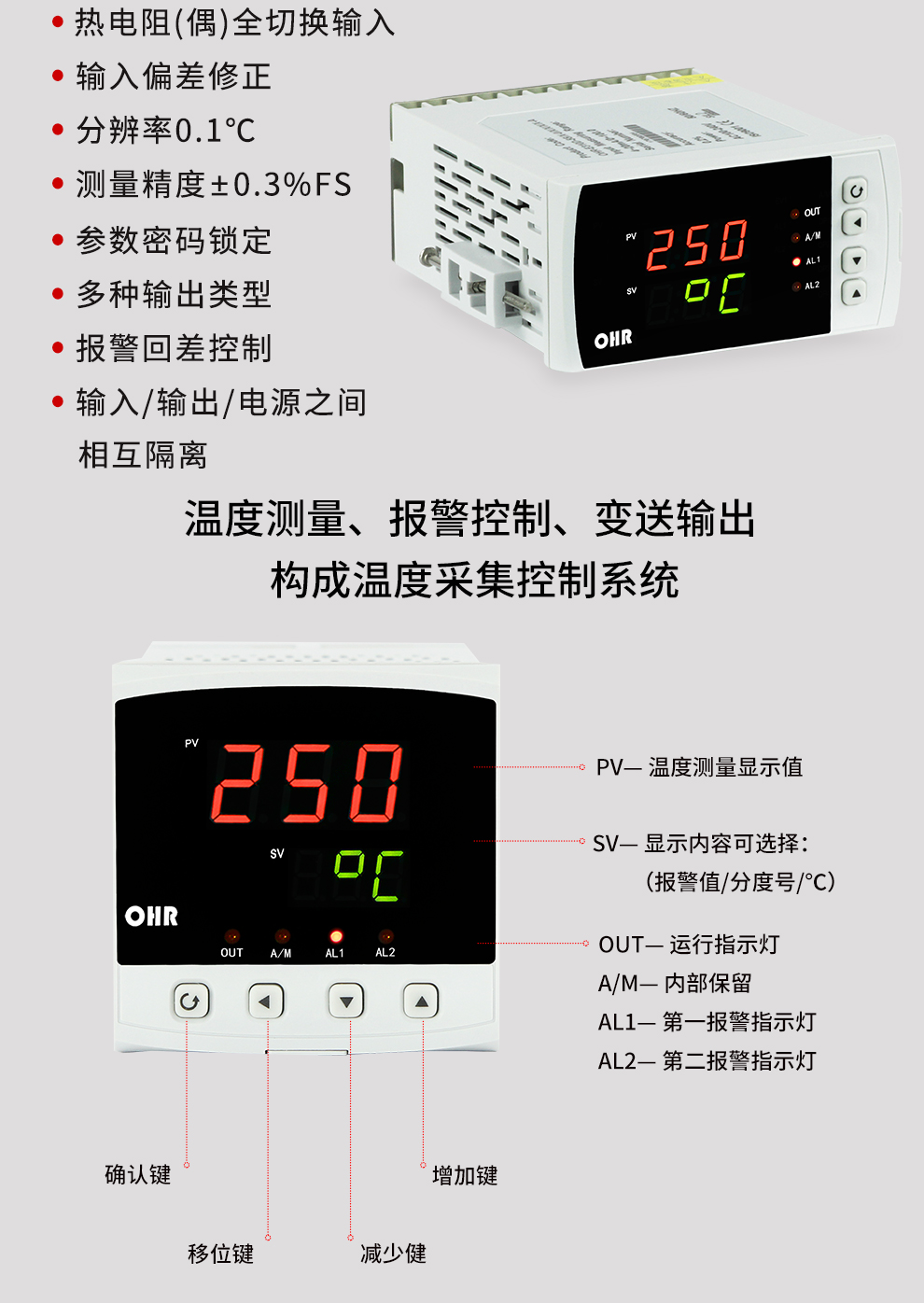 OHR-A103系列經(jīng)濟(jì)型三位數(shù)字顯示控制儀采用模塊化結(jié)構(gòu)、操作方便、性價(jià)比高,適用于輕工機(jī)械、烘箱、實(shí)驗(yàn)設(shè)備、加熱/冷卻等控溫范圍在0~999℃的對(duì)象。