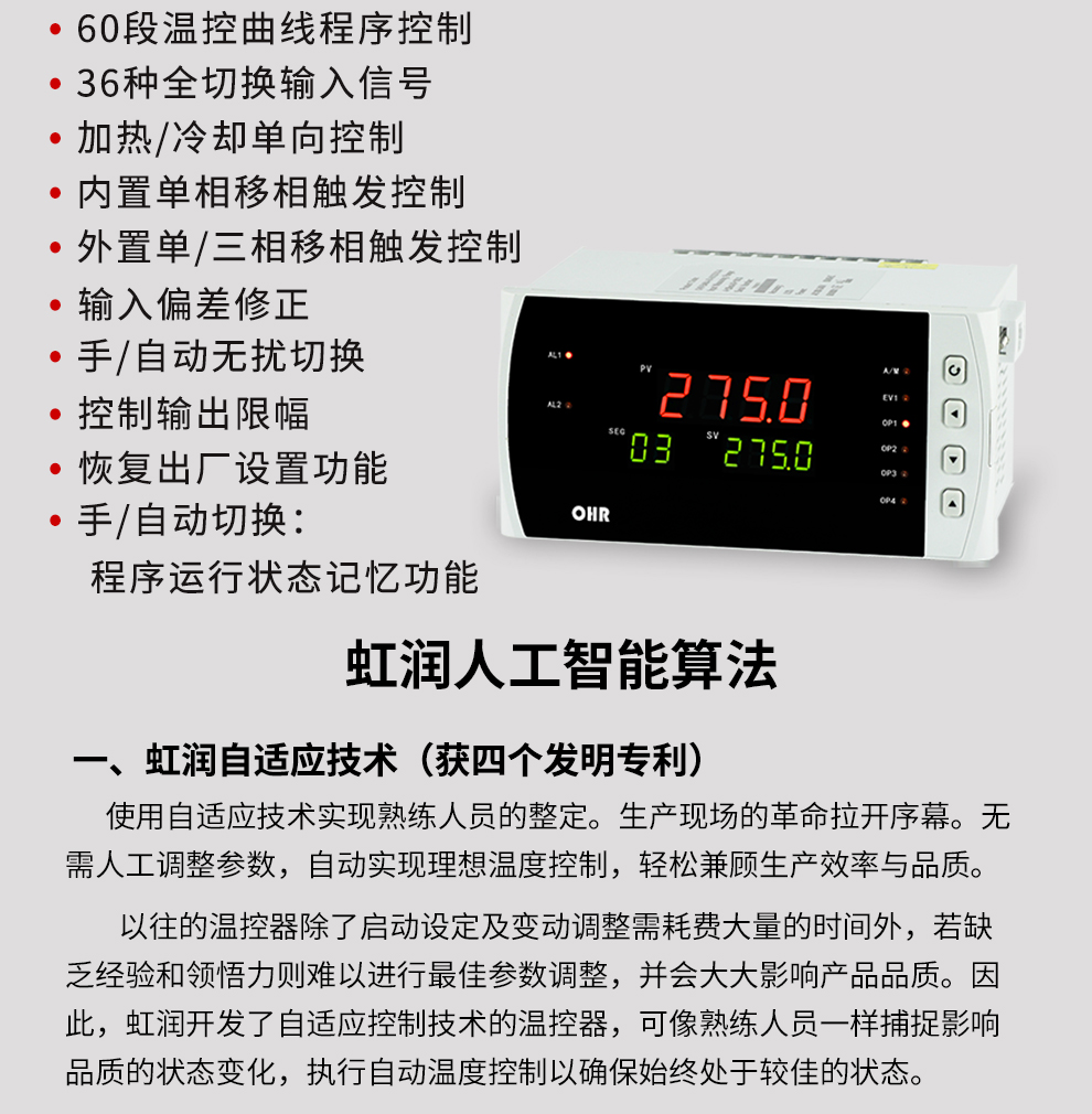 OHR-E400系列60段人工智能溫控器采用真正的人工智能算式,儀表啟動(dòng)自整定功能,可以根據(jù)被控對(duì)象的特性,自動(dòng)尋找參數(shù)以達(dá)到很好的控制效果,無需人工整定參數(shù)。控溫精度基本達(dá)±0.1℃,無超調(diào)、欠調(diào),達(dá)國(guó)際先進(jìn)水平。