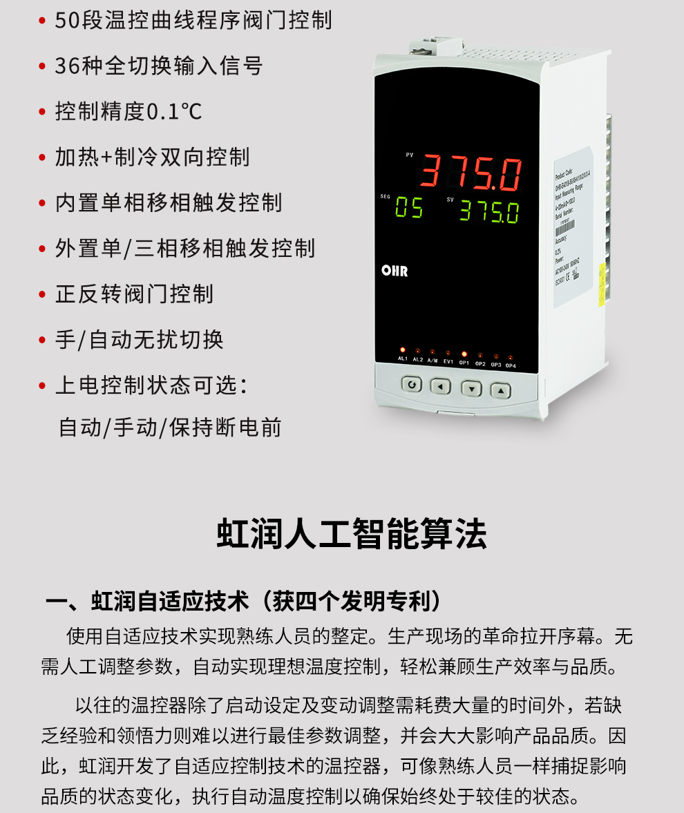 OHR-E401系列程序閥門溫控器/調(diào)節(jié)儀采用真正的人工智能算式,儀表啟動自整定功能,可以根據(jù)被控對象的特性,自動尋找最優(yōu)參數(shù)以達到很好的控制效果,無需人工整定參數(shù)。控溫精度基本達±0.1℃,無超調(diào)、欠調(diào),達國際先進水平。
