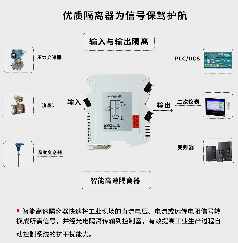 OHR-M38系列智能高速隔離器將工業(yè)現(xiàn)場的直流電壓、電流或遠傳電阻信號轉換成所需信號,經(jīng)隔離傳輸?shù)娇刂剖遥行岣吖I(yè)生產(chǎn)過程自動控制系統(tǒng)的抗干擾能力。