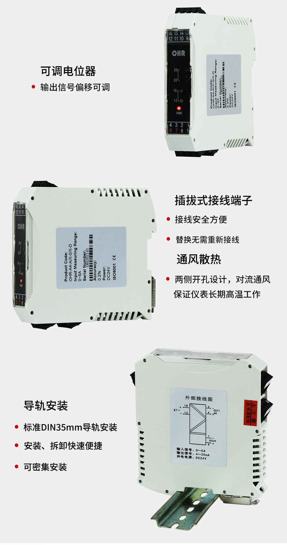 OHR-A4系列簡易型電量變送器用電磁隔離技術(shù),對電網(wǎng)或電路中的交流電流、電壓進(jìn)行實(shí)時測量,它可將被測交流電流、電壓轉(zhuǎn)換成按線性比例輸出的直流電流或者直流電壓信號,產(chǎn)品具有高精度、隔離電壓高、相應(yīng)時間快、低漂移、低功耗等特點(diǎn)。