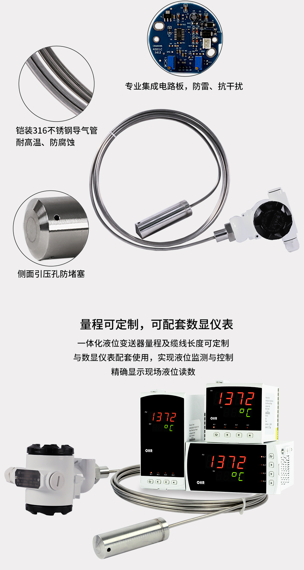 OHR-L2系列鎧裝投入式液位變送器使用進(jìn)口高精度、高穩(wěn)定性擴(kuò)散硅壓力敏感芯片,通過(guò)高可靠性的放大電路,將被測(cè)液體的液位信號(hào)轉(zhuǎn)換成4~20mA DC標(biāo)準(zhǔn)信號(hào)。