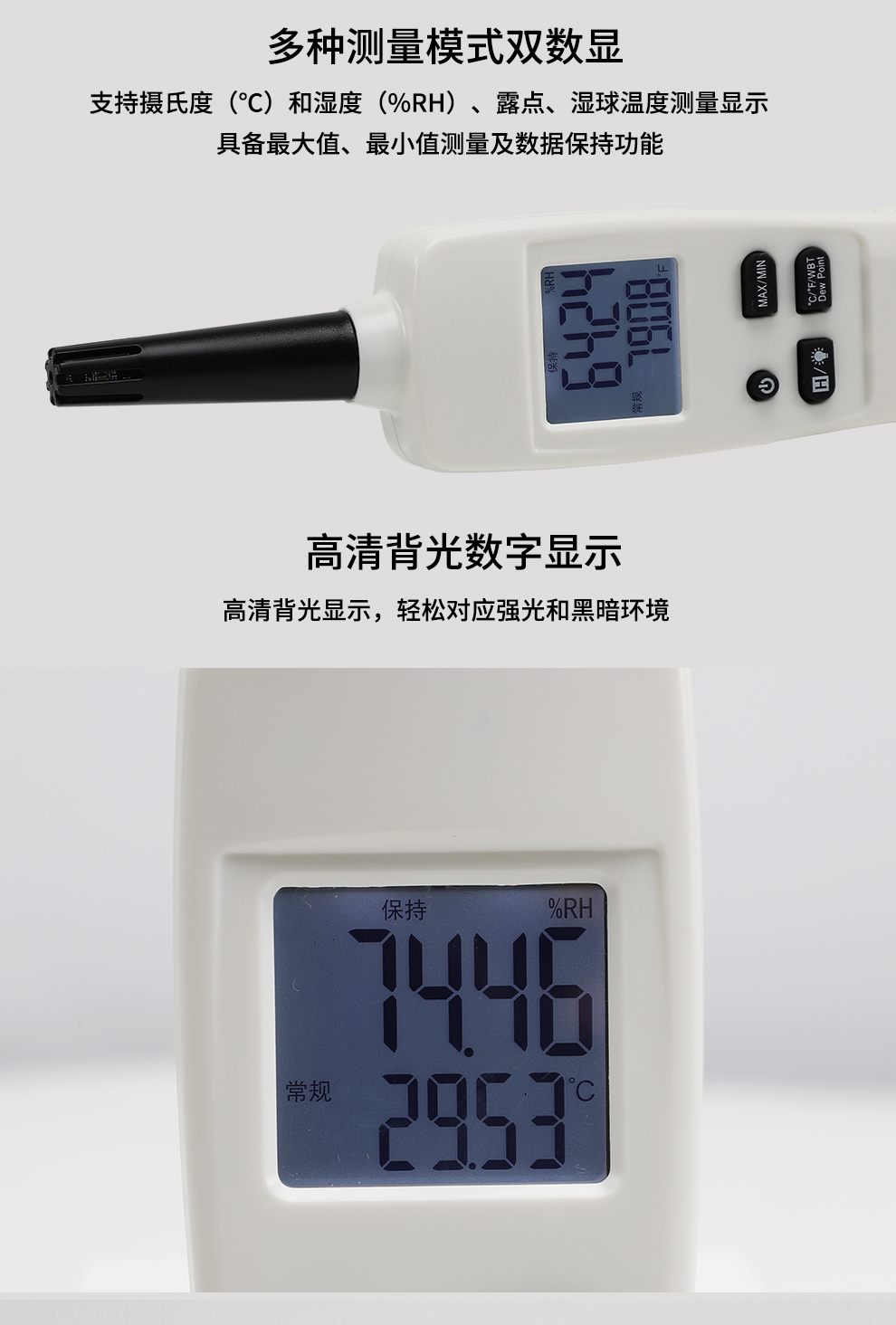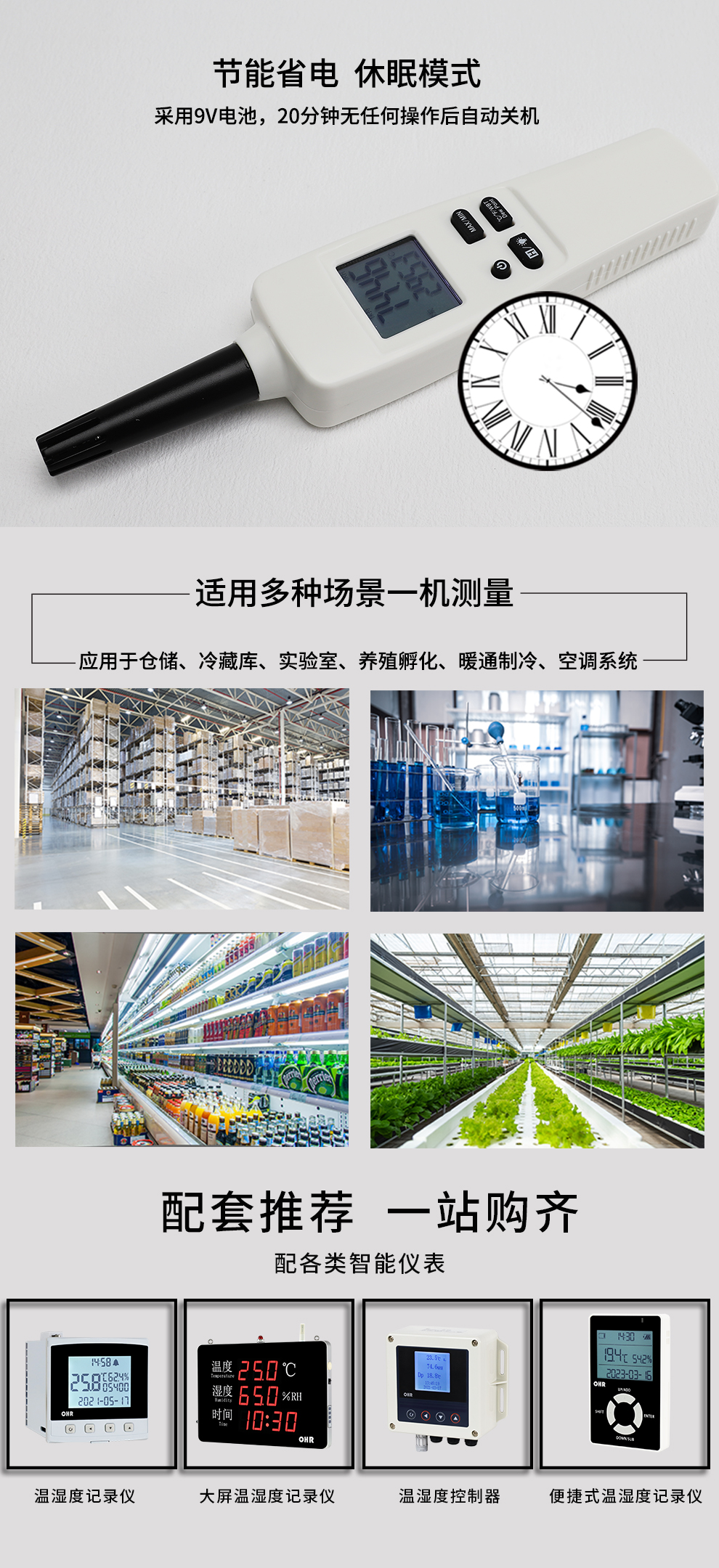 OHR-WS60系列手持式溫濕度檢測儀采用進口空氣溫度/濕度傳感器,響應時間快,具有空氣溫度、濕度、露點 溫度、濕球溫度測量功能,還具備最大值、最小值測量及數(shù)據(jù)保持功能。手持式高精度測量、小巧的外形便于攜 帶和使用,帶白色背光的雙顯示液晶屏可在黑暗環(huán)境中使用。