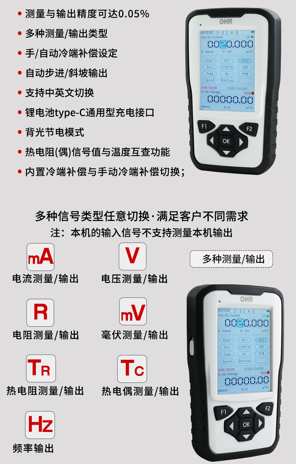 OHR-D00經(jīng)濟型過程校驗儀是帶測量與輸出的過程信號校驗儀。產(chǎn)品具 有高精度、信號任意切換、續(xù)航能力強、大彩屏占比、小巧便攜等特點, 產(chǎn)品功能設(shè)置簡單易用,為使用者帶來了更便捷的體驗。
