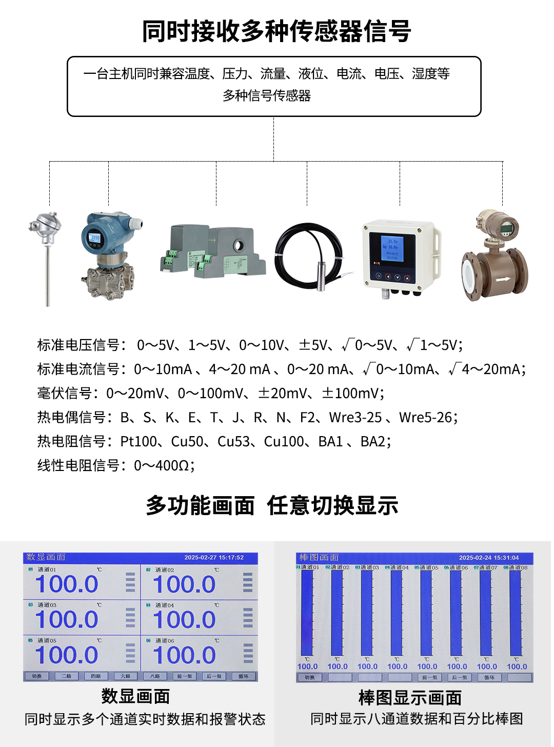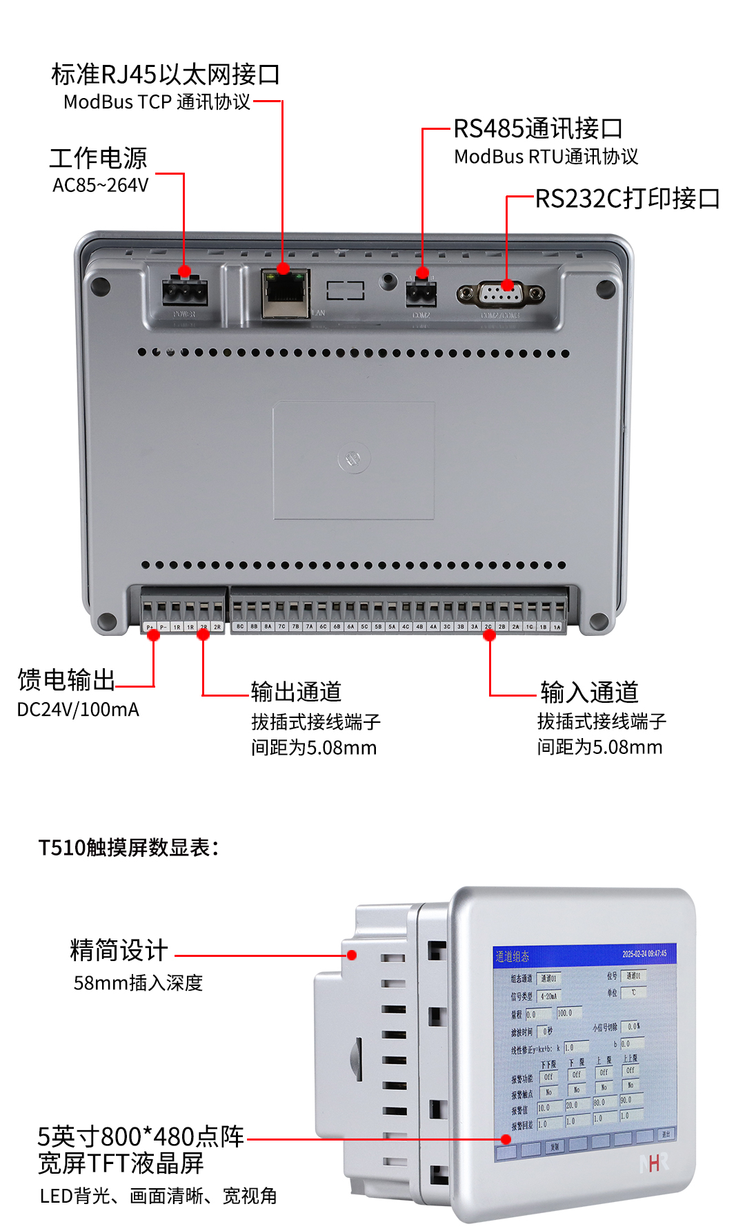 NHR系列觸摸屏數(shù)顯表采用新型大規(guī)模集成電路,對(duì)輸入、輸出、電源、信號(hào)采取可靠保護(hù)和強(qiáng)抗干擾設(shè)計(jì)。4路萬能信號(hào)輸入(可組態(tài)選擇輸入:標(biāo)準(zhǔn)電壓、標(biāo)準(zhǔn)電流、熱電偶、熱電阻、毫伏等)。可帶2路報(bào)警輸出,1個(gè)饋電輸出,RS485通訊接口,以太網(wǎng)接口,微型打印機(jī)接口;具有強(qiáng)大的顯示功能,實(shí)時(shí)測量顯示,棒圖顯示,報(bào)警狀態(tài)顯示,組態(tài)畫面顯示等。